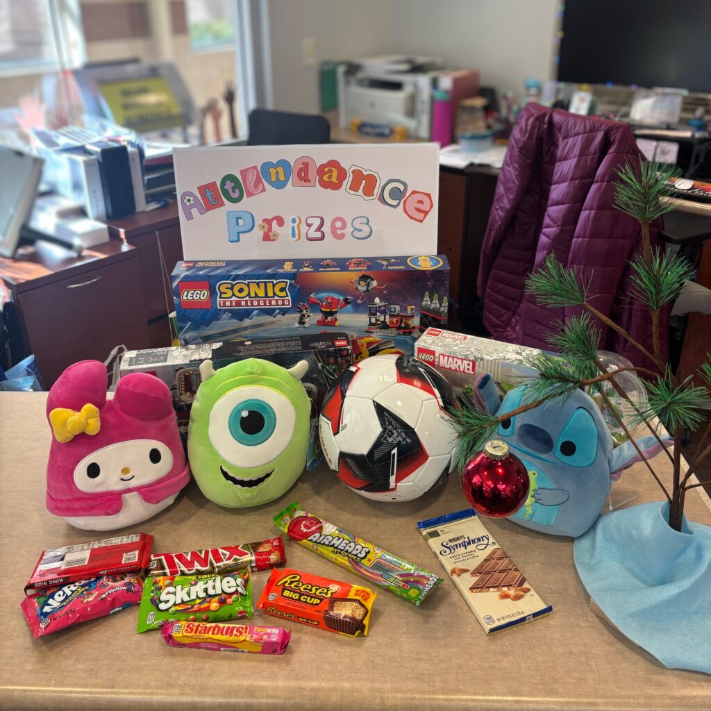 In December before the holiday recess, we will be having a Grand Prize Drawing for prizes for categories such as Most Improved Attendance and Perfect Attendance. In addition, every time students are in school for the full week they are entered into the drawing. Some of the prizes include king-sized candy bars, soccer balls, American Girl dolls, Squishmallows, Lego sets, and even a scooter.