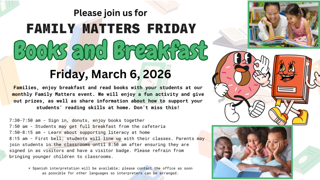 We will have our next Family Matters event on Friday, March 6, starting at 7:30am. Our theme will be Books and Breakfast in recognition of March Reading Month and Read Across America Week.