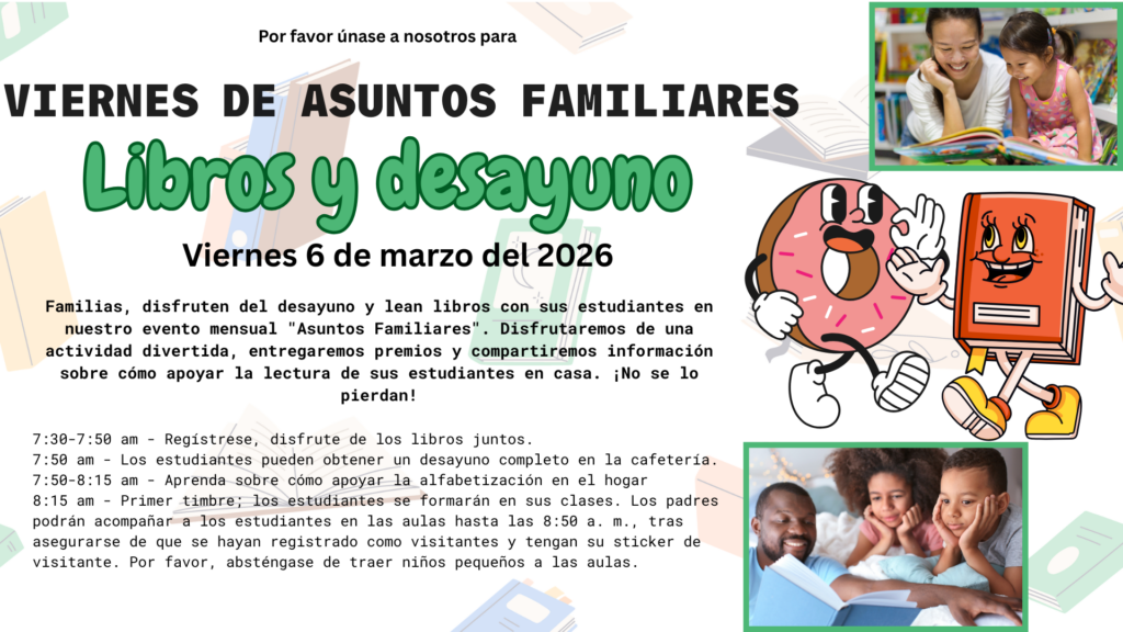 Please join us for donuts and reading with your students. We will have information about supporting your students at home as well as prizes.