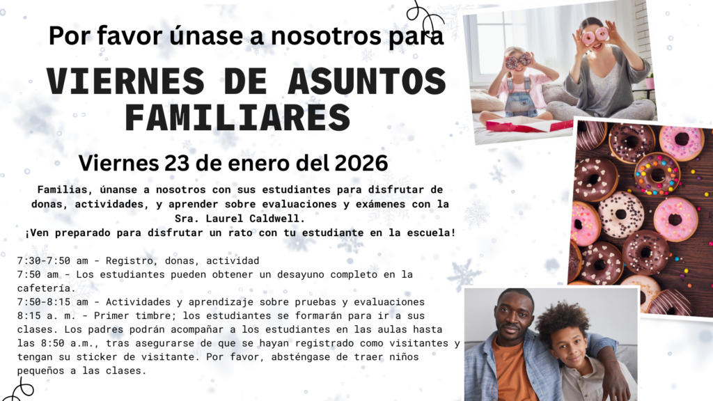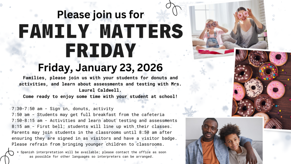 We invite families to our next Family Matters Friday on January 23 at 7:30am. We will have donuts and activities, and Mrs. Laurel Caldwell will be sharing information about how to support your students during tests and assessments. When the bell rings, we invite you to head to class with your student for Morning Meeting (please refrain from bringing young children to classrooms). We will see you there!