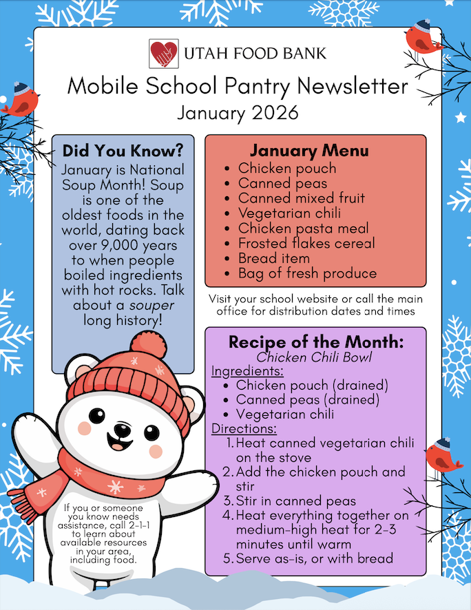 Our next opportunity for free groceries at our monthly Mobile Food Pantry is Tuesday, January 13, at 3:05pm. Students and/or families can pick up a bag of groceries at that time, right after school. Please be aware that it is heavy so plan accordingly!