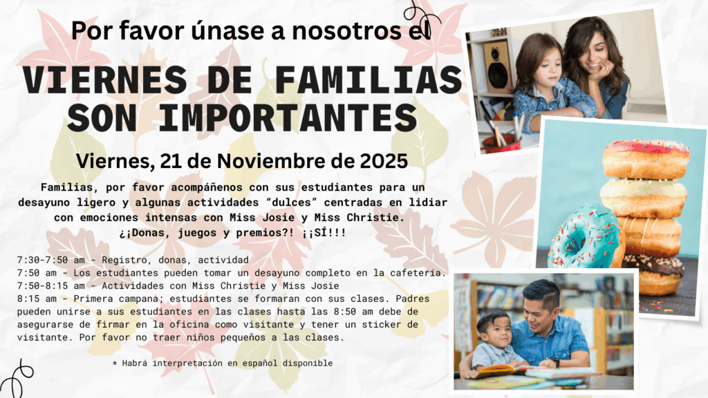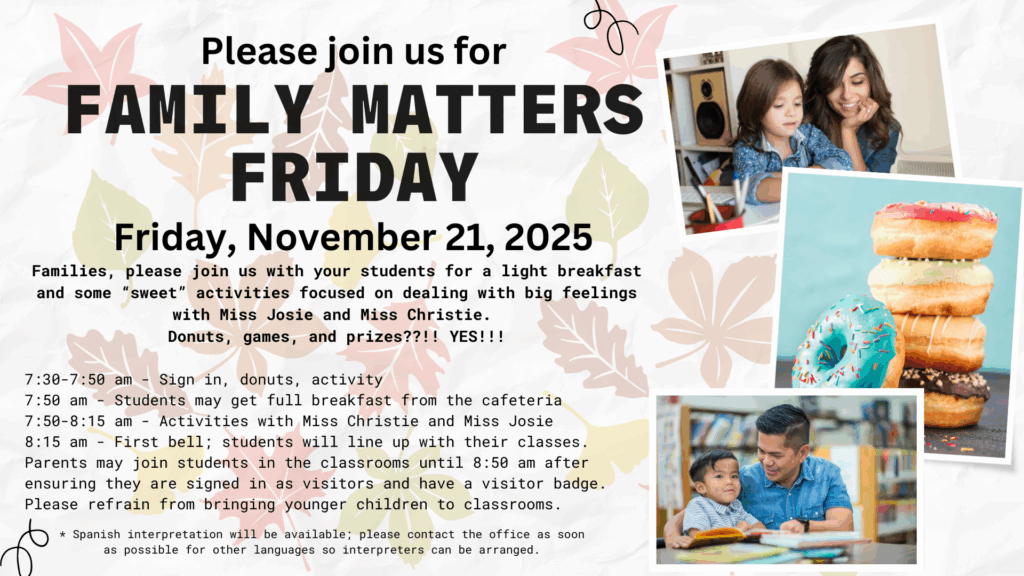 On Friday, November 21, please join us with your students for our monthly Family Matters event at 7:30am. Miss Josie and Miss Christie will be facilitating some fun activities that will help us learn more about using coping skills when we have big feelings. Donuts, games, and prizes? Yes!!!