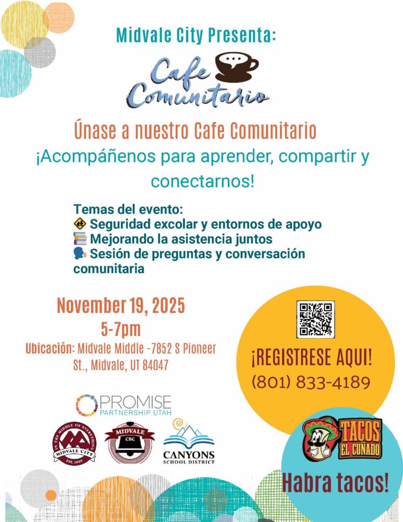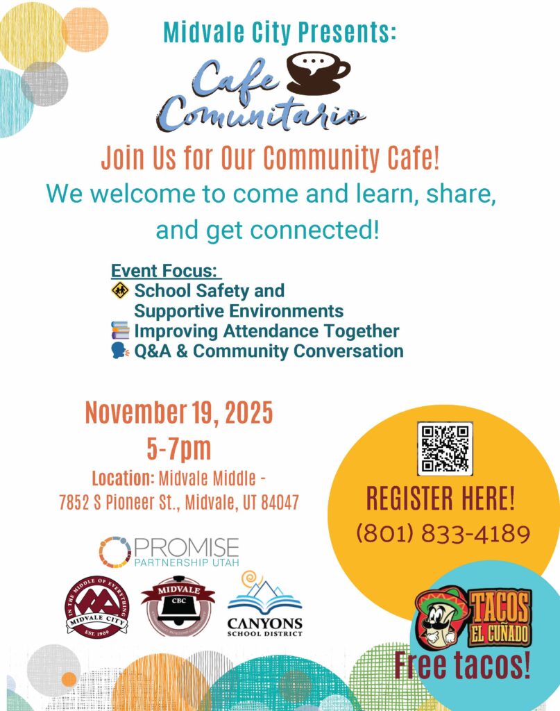 Midvale City’s first Community Café will be held this week on Wednesday, November 19, from 5:00-7:00pm at Midvale Middle School. The focus of the event will be school safety and supportive environments, improving attendance together, and a time for questions, answers, and conversation. There will also be tacos! Register by calling 801-833-4189 or scanning the QR Code on the flyer above.