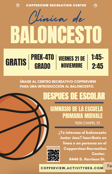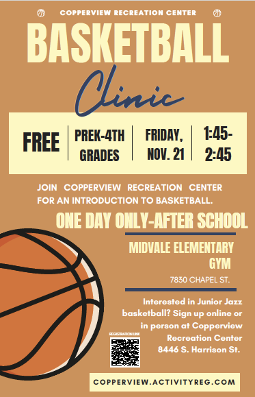 Copperview Recreation Center is offering a free basketball clinic, an opportunity to learn to play basketball, on Friday, November 21, from 1:45-2:45pm here at Midvale Elementary School. This is open to students from Pre-K through 4th grade.
