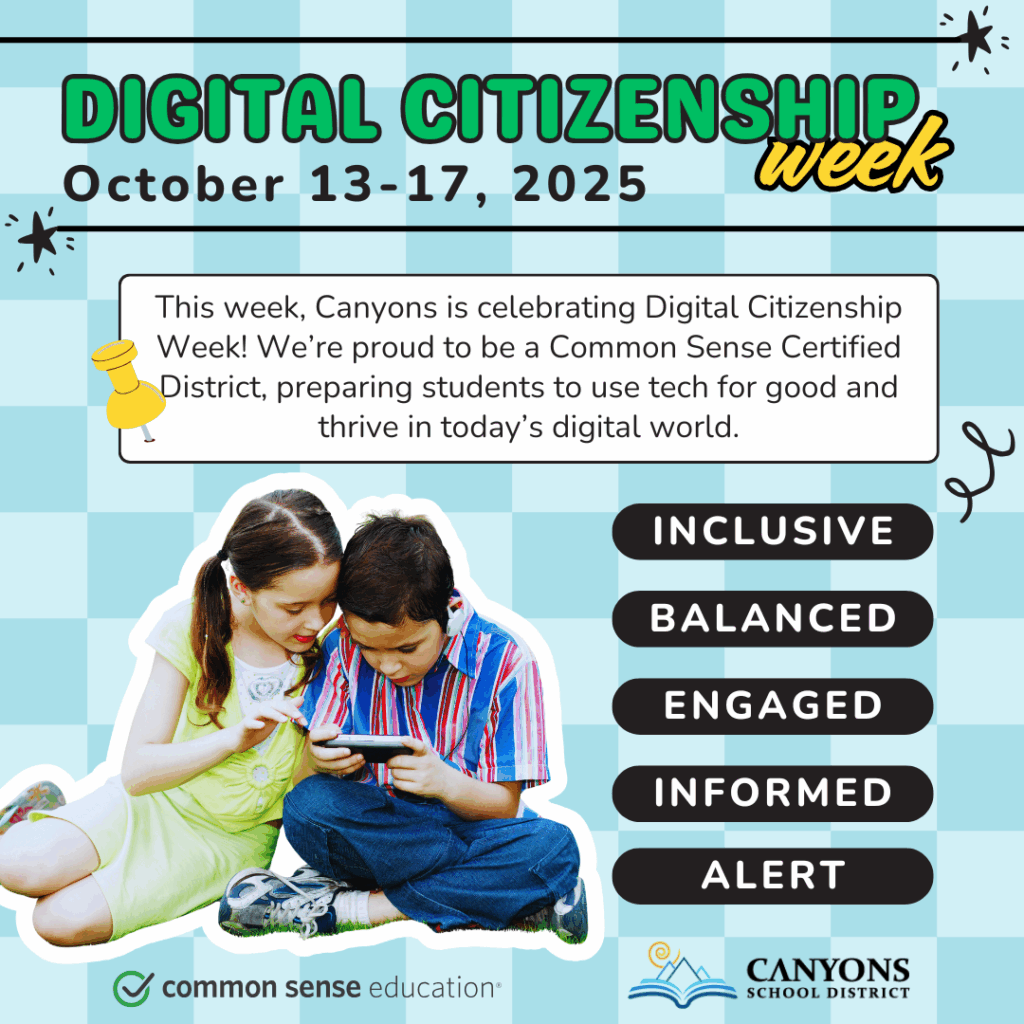 This week is Digital Citizenship Week! Digital citizenship isn’t just about screens—it’s about helping kids make healthy, thoughtful choices in all the ways they connect with the world. At school, we practice these skills everyday, and during Digital Citizenship Week, we pause to review and celebrate what students are learning. Conversations at home help children understand when and how technology use makes sense and how it can align with your family’s values and goals. Small steps like talking about kindness online or setting aside unplugged family time can make a big difference in raising confident digital citizens.