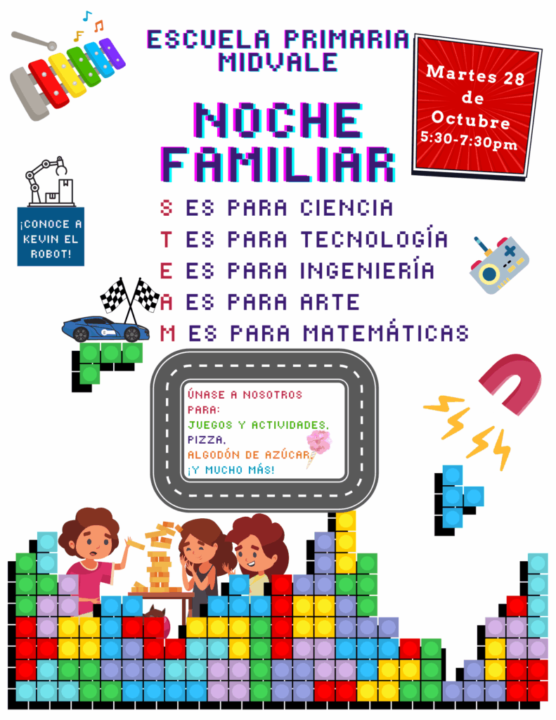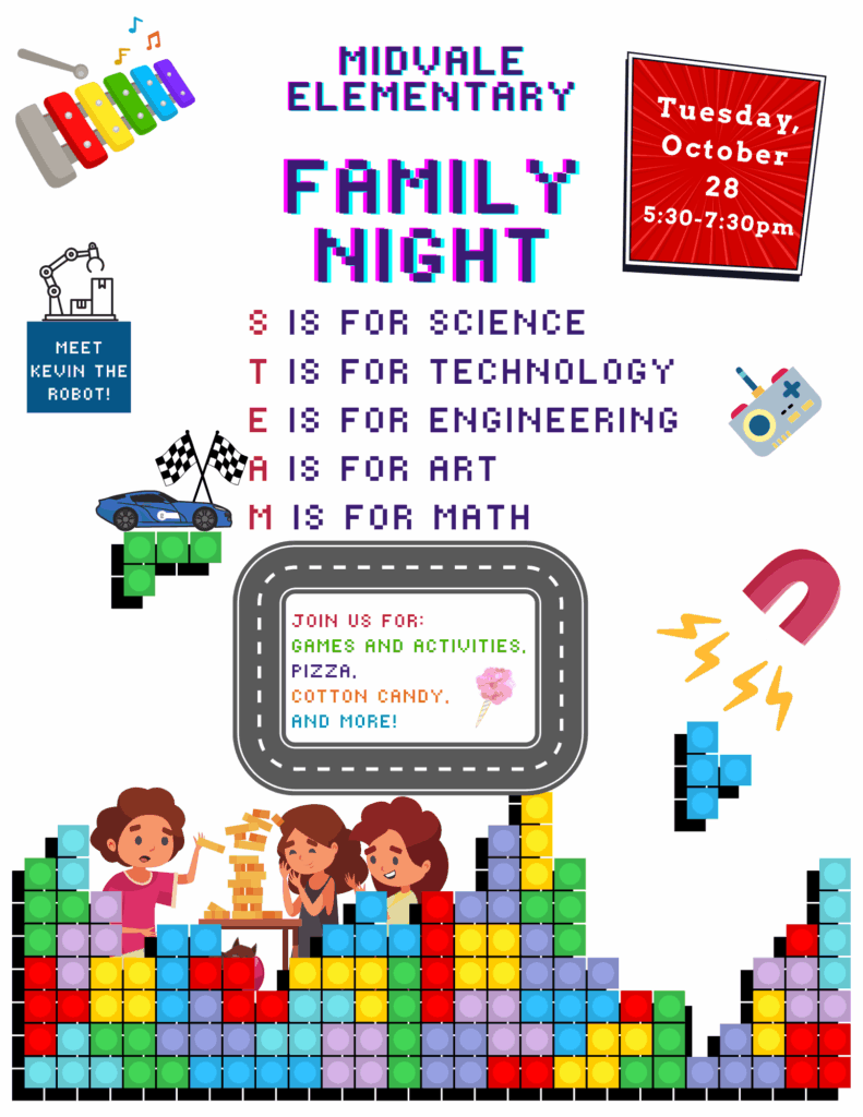 Our fall Family Night is going to be on Tuesday, October 28, from 5:30-7:30pm. Join us for activities and games related to STEAM, or Science, Technology, Engineering, Art, and Math. Code a mouse to follow a path, learn how cotton candy is made and then taste this sweet treat, eat some pizza, build tracks to race cars, learn how to play a xylophone, meet a robot named Kevin, and so much more!