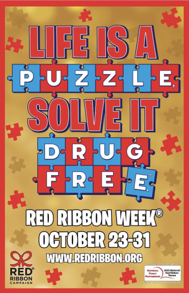 🎀 Red Ribbon week is 10/27 to 10/31. Watch for a red informational flyer describing all of the week’s activities! This years theme: “Life Is A Puzzle, Solve It Drug Free” 🧩Tuesday: Pledge to be Drug Free – Wear Red!