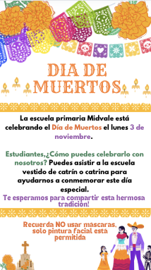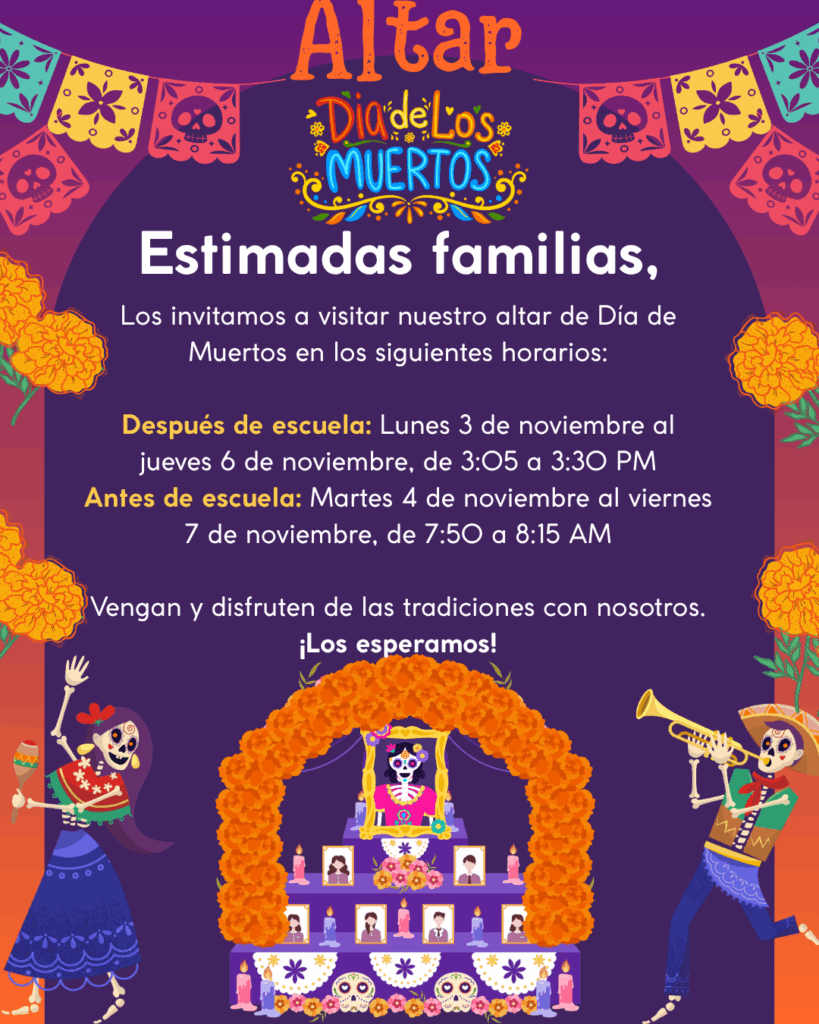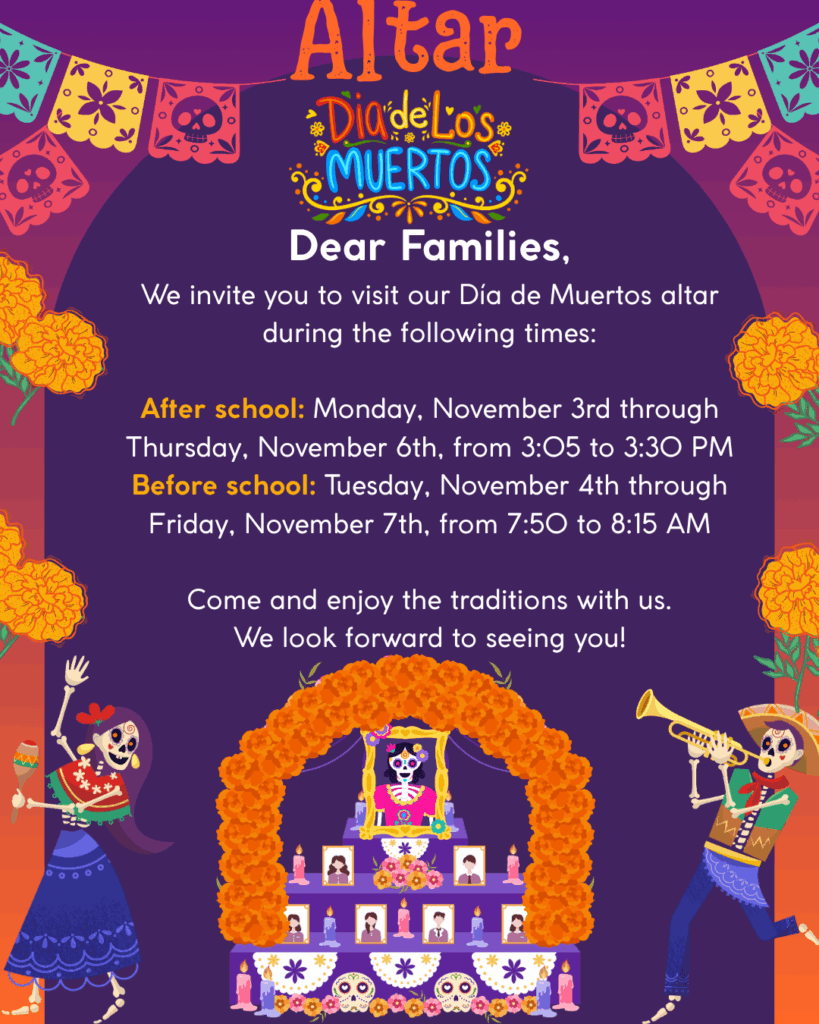 Monday, November 3-Friday, November 7: Visit the altar for Día de Muertos before and after school (except Monday morning)